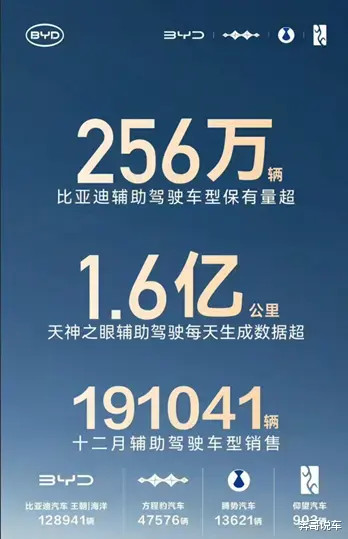 产品力的全面进阶为销量护航,智驾技术成为加分项。截至 2025 年 12 月,比亚迪辅助驾驶车型累计保有量超 256 万辆,稳居中国车企第一。“天神之眼” 智驾系统日均生成 1.6 亿公里数据,94.13% 的激活比例印证用户认可,12 月单月辅助驾驶车型销量近 19.1 万辆,其中王朝&海洋系列贡献 12.89 万辆,高端车型表现亮眼。全年 933 万次 AEB 自动紧急刹车触发,以及泊车安全损失兜底承诺,让智驾成为用户购车核心考量。