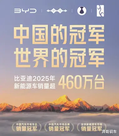 2025 年中国汽车市场年度榜单正式出炉,比亚迪以绝对优势交出亮眼成绩单:全年累计销售超460万辆,一举包揽中国汽车市场车企销量冠军、品牌销量冠军,并连续四年卫冕全球新能源汽车市场销量冠军,实现 “中国双冠 + 全球卫冕” 的三重突破,以王者之姿领跑行业,彰显世界冠军硬核实力。